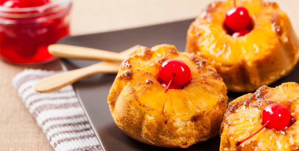 1)Preriscaldare il forno a 180°C 2)Ungete 6 pirottini per muffin con i 45 g di burro fuso e cospargeteli ognuno con di zucchero di canna scuro. 3)Adagiate una fetta di ananas in ogni pirottino. 4)In una ciotola capiente, unite farina, zucchero, burro, uova, vaniglia e il succo d'ananas. Mescolate bene! 5)Versare il composto così ottenuto sulla fetta d'ananas, riempiendo ogni pirottino per muffin per 2/3. Cuocete in forno preriscaldato per 25-30 minuti, fino a superare la prova dello stecchino (infilatene uno in ogni tortina - se esce pulito le monoporzioni sono pronte!) 6)Capovolgete immediatamente ogni pirottino su una griglia e lasciateli raffreddare. Mettete una ciliegina al centro di ogni anello di ananas e servite le vostre monoporzioni!